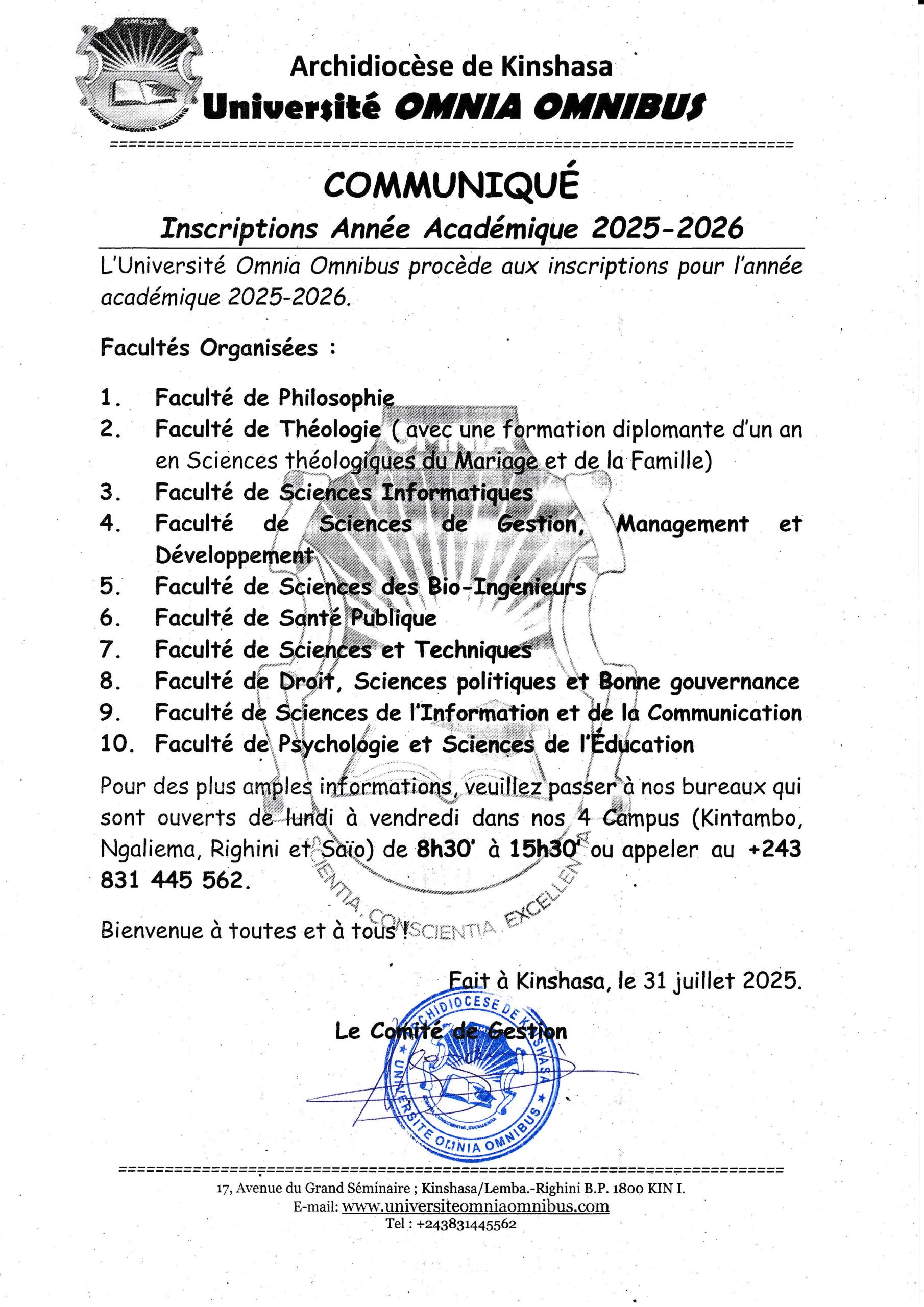 Pour toute information complémentaire, contactez-nous au +243 831 445 562 ou visitez notre site : www.universiteomniaomnibus.com.